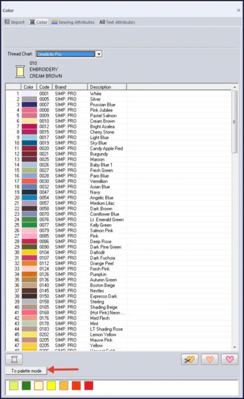 Figure #3[/caption] 4. To view colors in the palette by name and number, click on the box at the bottom of the color palette window, just below the image of the three small hearts. This box allows you to toggle between two options, To-List mode and To-Palette mode. You can easily switch back and forth. In addition, you can also switch between various brands of thread charts. See Figure #4. [caption id="attachment_24404" align="aligncenter" width="489"]