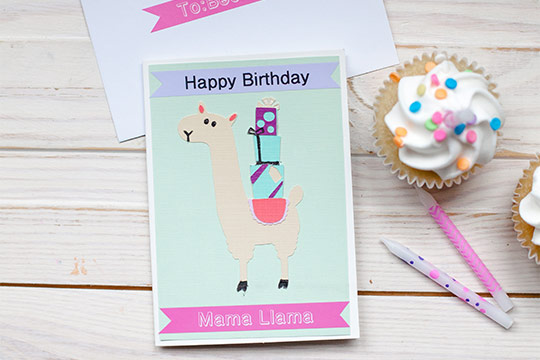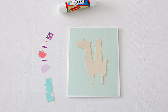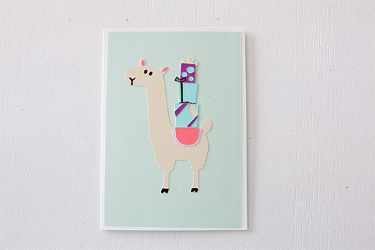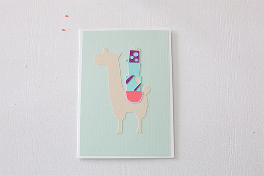 Glue each layers on starting with the llama, presents, saddle and ears. You can use the foam mounting squares to raise the llama on the birthday card for a 3D effect. This step is optional but very trendy in card making.