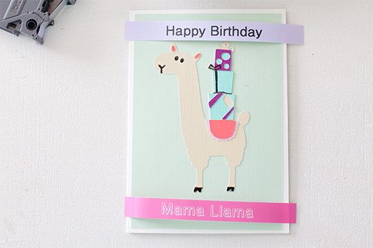 Now insert the Berry Pink tape ribbon. Type MAMA LLAMA in Helsinki font. Adjust the style to Shadow. Keep the size and width as normal. Print and trim a V on each ends of the tape.