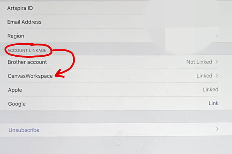 From there, you will choose Account and then User Information. Under User Information, you will see the “Account Linkage” list. There are four kinds of accounts that you can link to your Artspira account: a Brother account, a CanvasWorkspace account, an Apple account, and a Google account. We want to link to our CanvasWorkspace account.