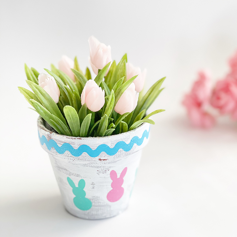 To celebrate all things spring, why not try your hand at this cute and festive custom bunny flower pot? You’ll love how versatile, fun, and easy this spring craft is – not to mention the gorgeous results. This is also a great way to create a semi-homemade gift! Little flower planters like this are inexpensive, easy to find, and most materials from vinyl to paint will work on them.