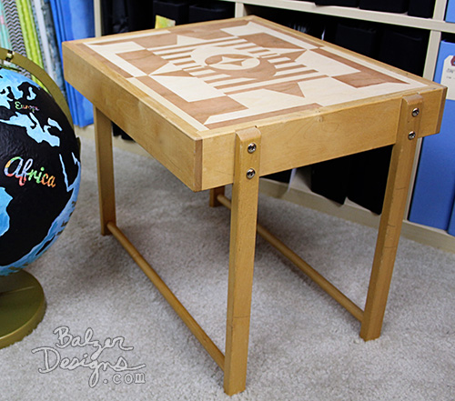 I bought it at a thrift store for a few dollars. The top was kind of banged up and had staples all over it. So, I used my ScanNCut machine to cut two colors of wood veneer to refinish the table with the look of inlay wood.