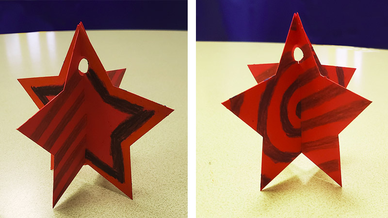 6) Once you have finished decorating, slide two stars together over the cut lines (star with top cut line slides up the star with the bottom cut line).
