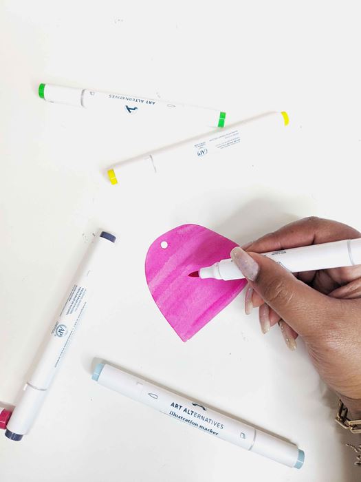 6. Using your illustration markers, draw a fun print or color the entire shape a solid color. (Note: There is a shiny and matte side. Color on the matte side of the plastic.)
