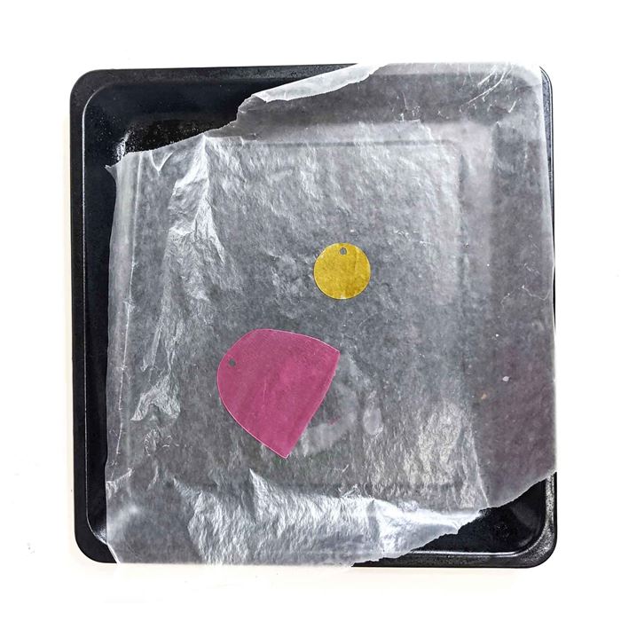 7. Place your cutouts on a wax paper lined baking tray and place in the oven. Stay put! The shrinking only takes 2-3 minutes. Its a really quick process.