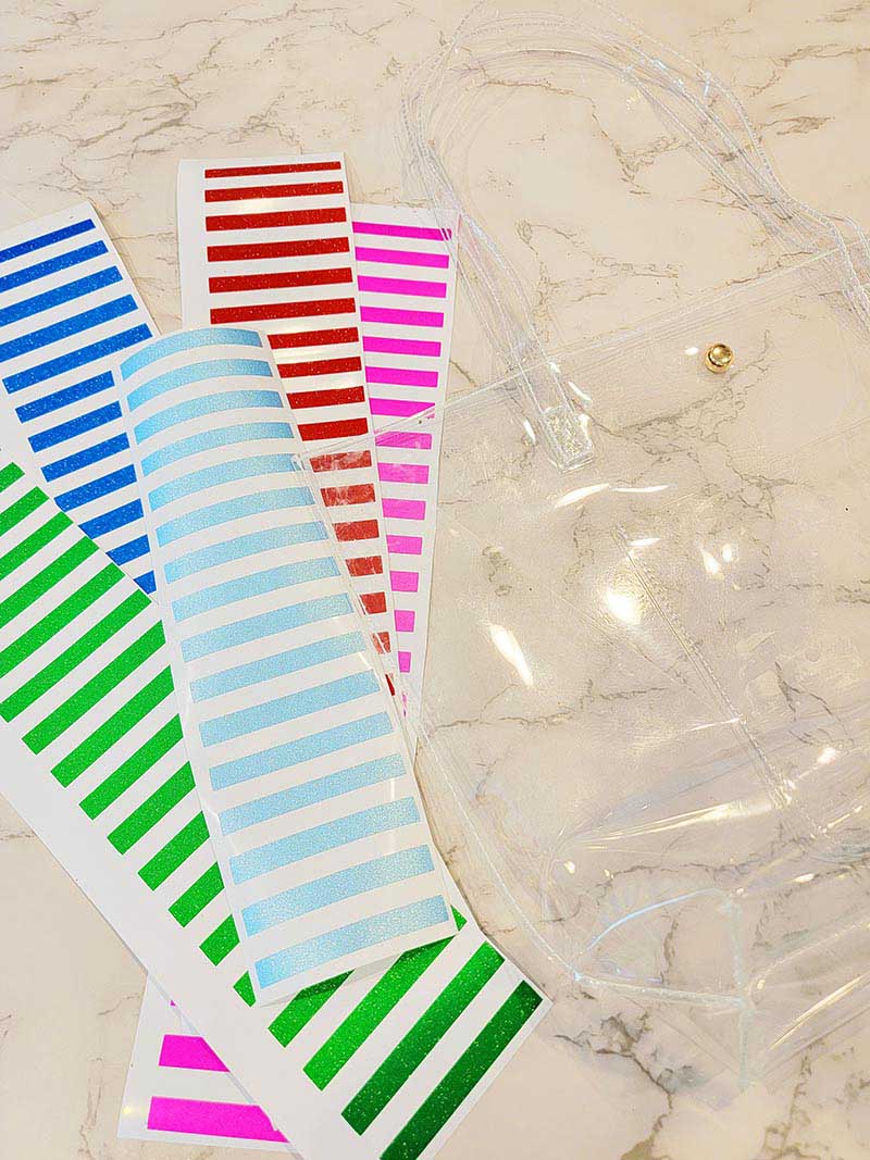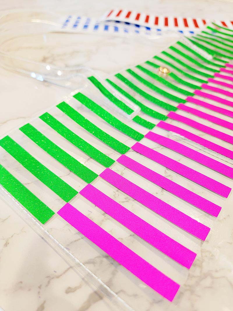 6. With the stripes in the vertical direction, we will start with applying the vinyl to the top of the bag. The clear transfer tape helps because it ensures that you lay down the vinyl as straight as possible. Once you lay down the first color of stripes, repeat until all stripes are placed on the front of the bag. Design Idea: When placing the stripes, you can lay them all centered to each other; Laying them all in one line vertically down the front of the bag. Another option is to off-center the stripes; laying the stripes opposite of one another like a checkerboard. I only designed the front of my bag, but feel free to design the back if you want. That’s the best part of customizing things. Allow your creativity to lead you.