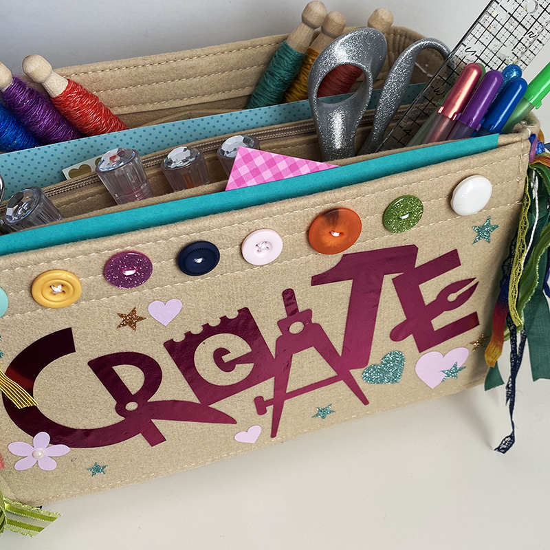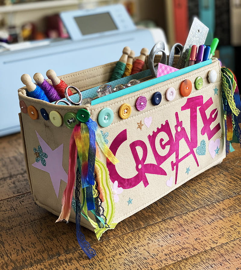 One of my favorite things about the ScanNCut DX is that I can use small scraps of vinyl, and I never have to waste material that I feel may be too small to use – I can get the scraps filled up and put to good use! With the help of some radiant ribbons and stylish buttons to add dimension, this project was fun to do, and my new organizer filled up quickly on my desk. I hope that I’ve inspired you through this tutorial to try and customize your crafts storage organizer – and make every aspect of your crafting colorful and fun.Supplies needed: ScanNCut Dx, standard mat, iron-on vinyl in assorted colors, craft pick, organizer, buttons, thread, ribbon