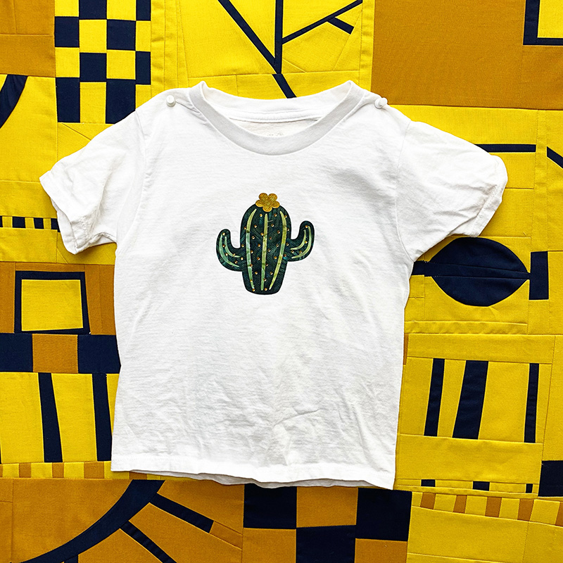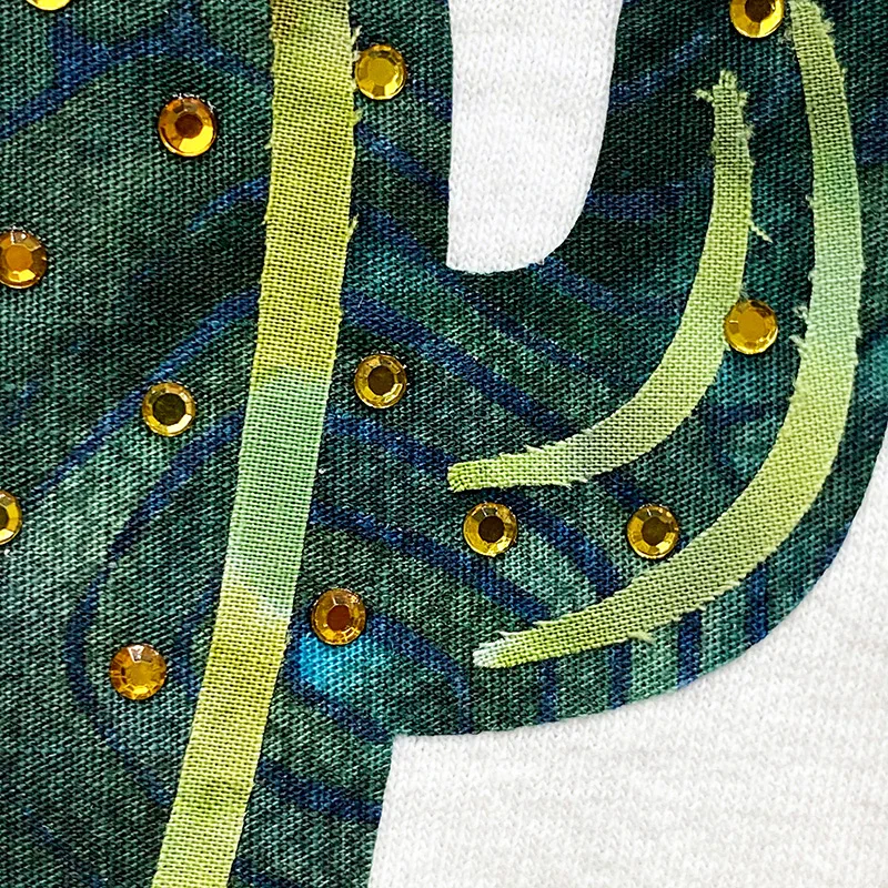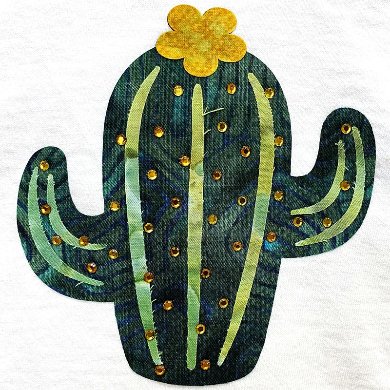 It turned out super cute! Because I used fabric, it does tend to have some fray at the edges. HTV would be perfect and not have any fray. HTV would also be easier to place (for the little extra details) because it comes with a carrier sheet. But, alas, I don’t own any green HTV, so I had to improvise and I’m so glad that I did! I love the way the patterned fabric looks with the rhinestones.
