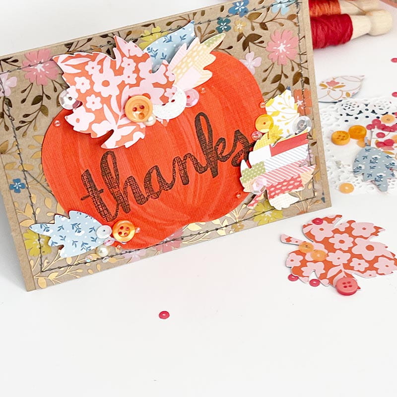 For a card like this, the formula that I like to use is a decorative background, a solid-colored large shape, and then layered small shapes. In this example that means an acetate sheet and stitching on the background, an orange pumpkin, and of course the little patterned leaves. There are many options here, and this is a creative formula that works well for cards – whether you make them regularly or not!