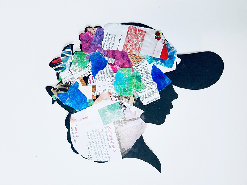 8. On the back side of the lady die-cut, use a glue stick to adhere scraps of paper, fabric, or magazines to the open sections of the pattern and allow to dry.
