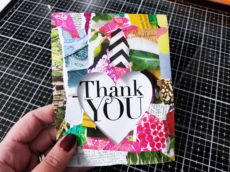 6. Remove the card and stamp the sentiment onto the inside of the card so it shows through the shape you cut out.