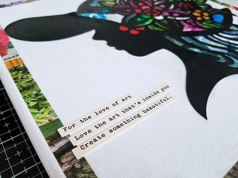 12. On the lady die-cut, trim off any scrap papers that extend beyond the edge of the shape and then use gel medium to adhesive it to the center of the canvas. Allow to dry.