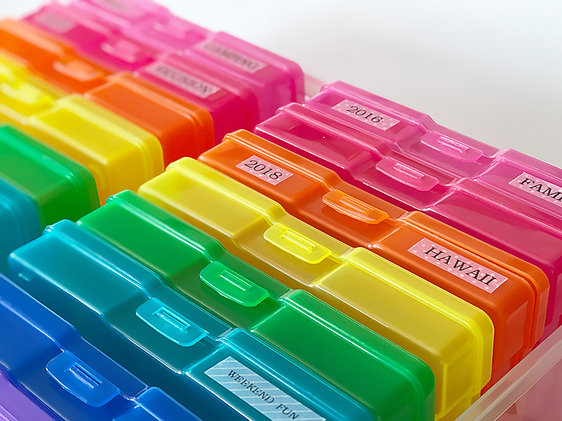This can be repeated on all of your individual boxes – and the details will help you remember what photos you’ve sorted, of what, and where to find them later on. With the Brother P-touch Embellish ELITE, you can select a number of colors and patterns for the tape to match your mood – or the container.