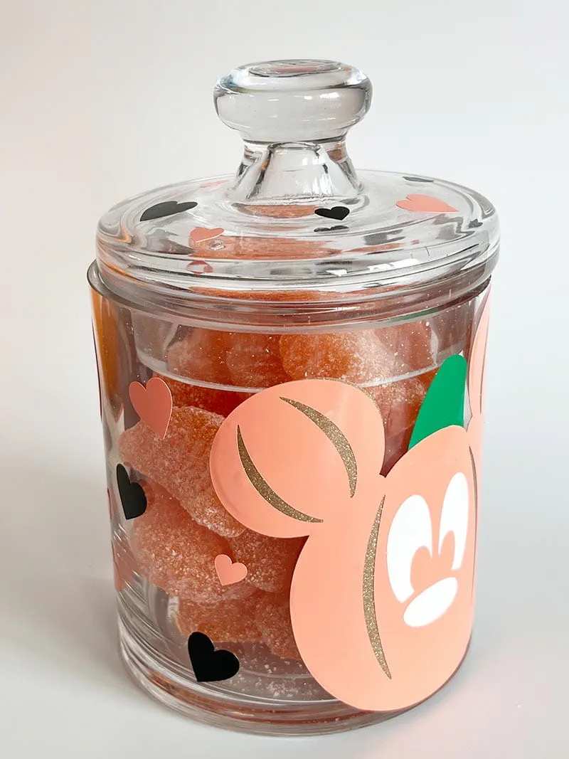 - If desired, use a scrap of orange and or black vinyl and select and cut out ¼ - ½ inch hearts. Add to fill in space on lid and around the pumpkin heads.