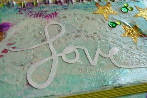 You can also add personal touches to your artistic journal by scanning in hand drawn sentiments for cutting out on your favorite material. This hand drawn “Love” sentiment was cut from white cardstock and then decoupaged onto the cover to add that extra-special touch.