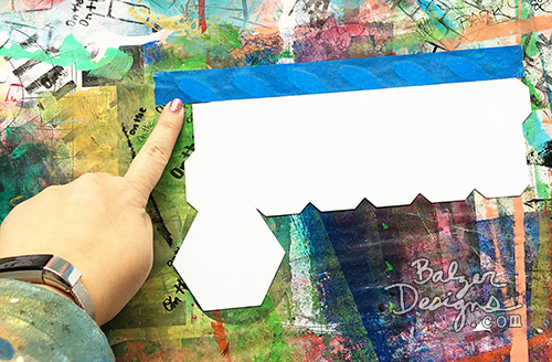 As you can see the design consists of a box, a center circle, and two flowers. I wanted to protect the “petals” on that bottom edge of the box shape from getting covered by stenciling, so I used painter’s tape to protect them.