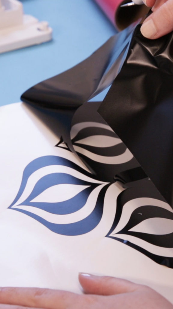 5. Roll out a length of transfer paper that matches the length of vinyl. Begin to separate the backing from the transfer paper and starting at one end, smooth the transfer paper over the top of the vinyl designs.