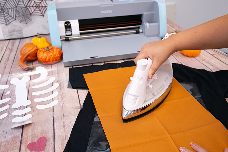 8. Place the vinyl sticky side down onto the center portion of the correctly sized T-shirt. (Match the larger skeleton cutout with the larger shirt, etc.)