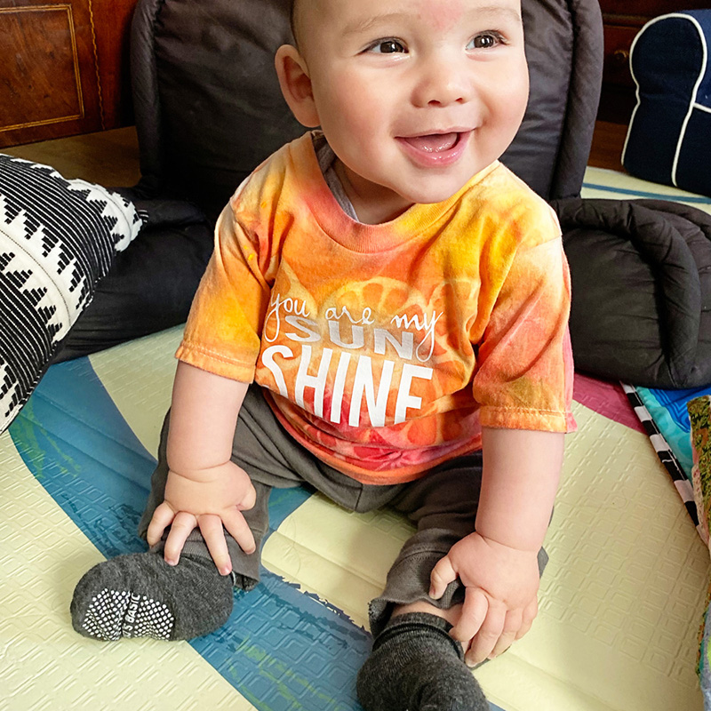I made him a super cute sun printed shirt with some heat transfer vinyl (HTV) words across the front.