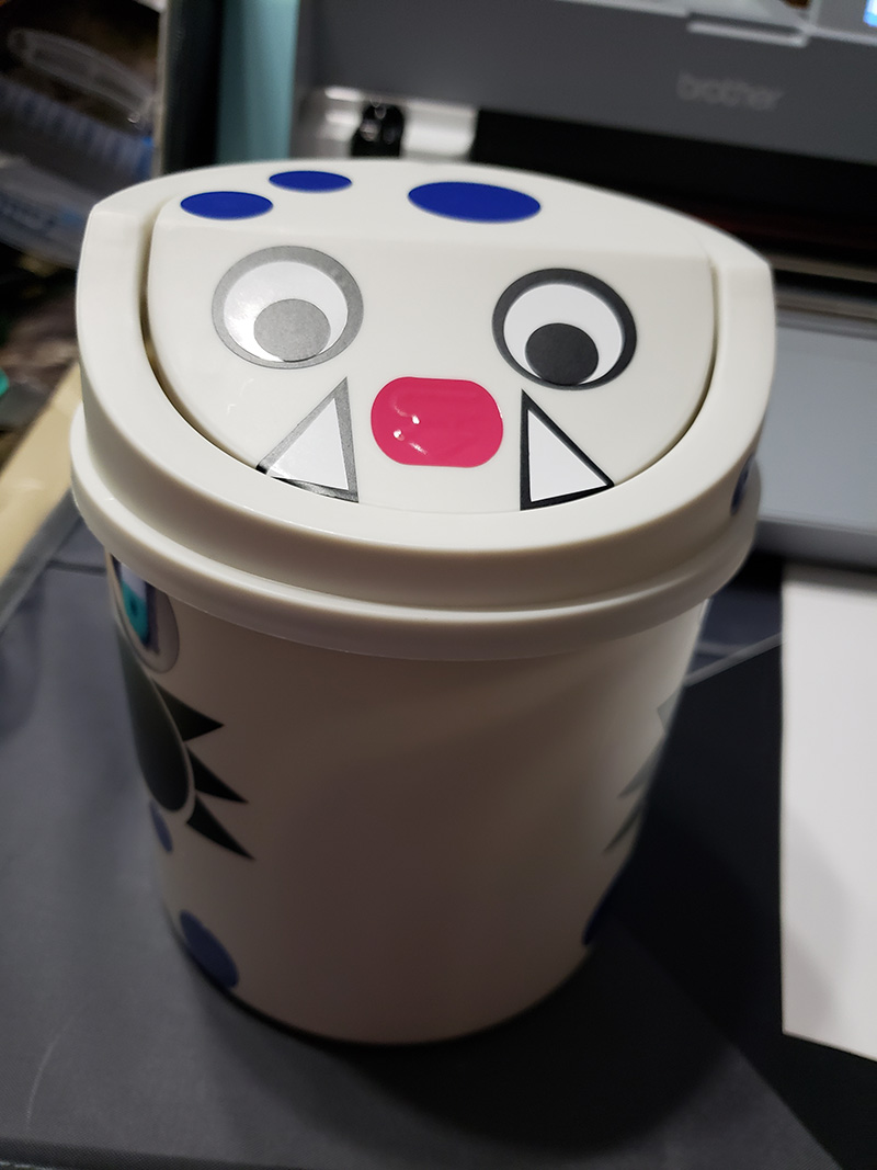 7. Place the smallest black circles at the bottom of the white circles to complete the eyes. Place the circle paws and triangle claws on the sides of the trash can. Then between the paws, using transfer tape, place the "Feed Me" in between the paws.