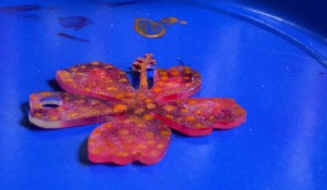 Step 3: Once baked, start painting your design onto the rough side of your design. For this coloring, we used pink with orange polka dots in a metallic acrylic paint.