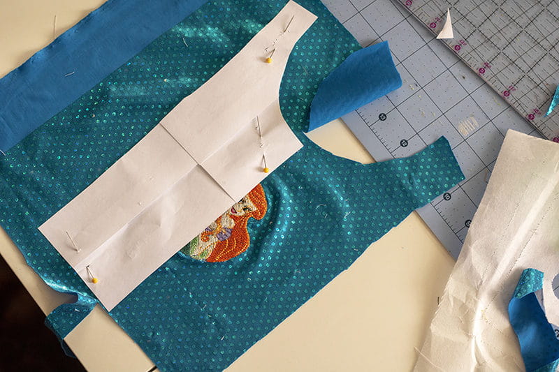 I couldn’t really fold the mermaid design in half to cut my suit pattern, so I just placed the fold edge in the middle of the design, cut on one side, then flipped it over and cut the other side of the suit front.