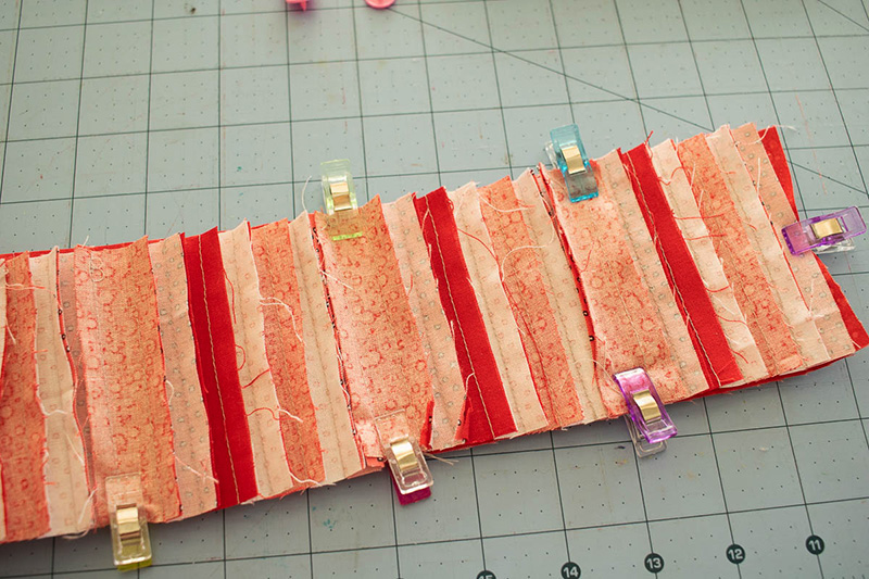 I made a simple striped design for my project, but you can use this basic idea and create ANY design you want. For the stripes, cut 1” strips of 4-5 different fabrics. My strips were from fat quarters and I cut the full length of fabric. I had 7 strips of 4 fabrics.