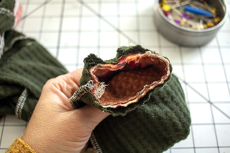 Use a serger or a knit stitch on your regular sewing machine to sew the cuff to the sleeve. I use a standard ⅜” seam allowance. You are sewing through three layers of fabric, make sure to catch all of them.