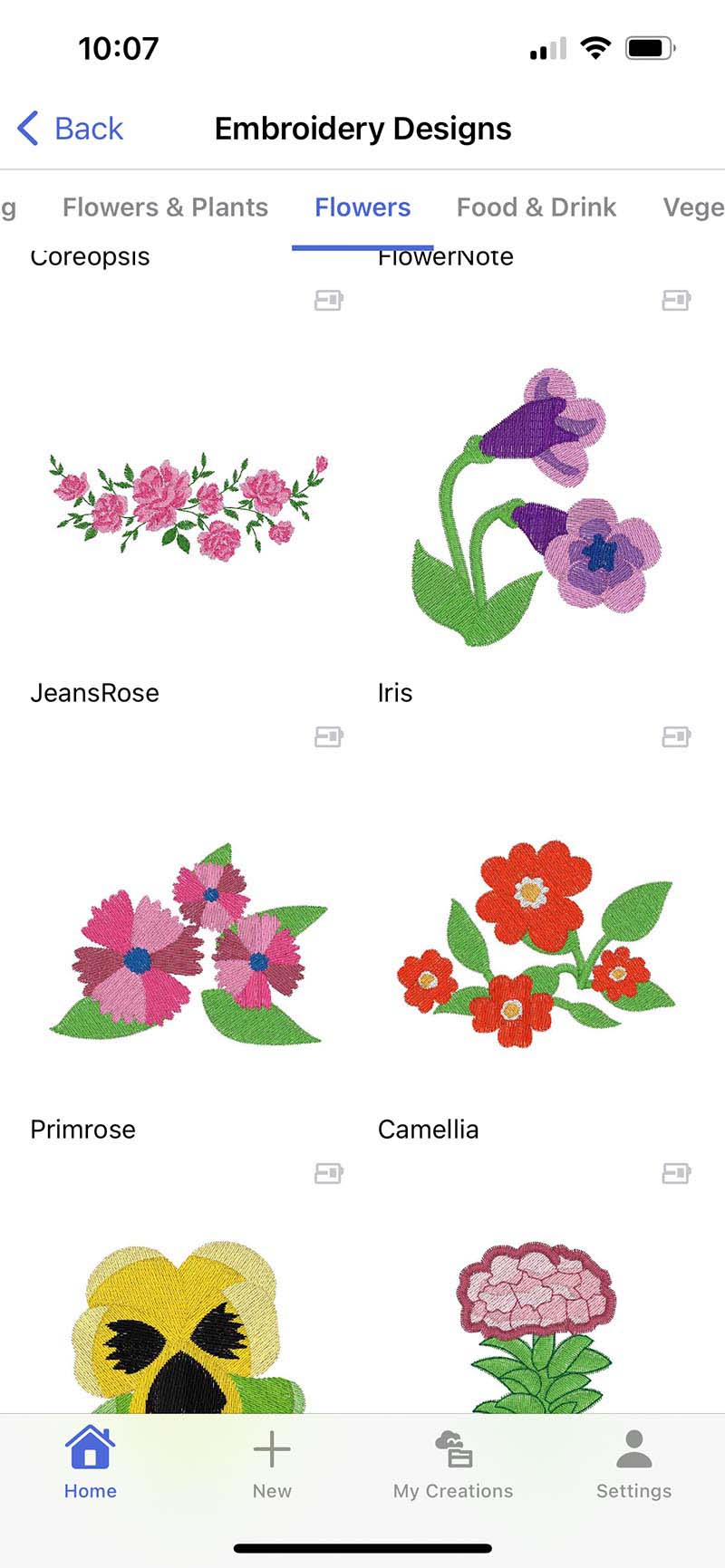 The shape of the flowers was very very similar to the flowers in the Artspira App. From the homepage I went to embroidery, then to the flowers. This pink primrose design was perfect. You can scroll down on the design to see the colors needed for the design. Or, like me, you can see how many colors you need to match to your fabric.