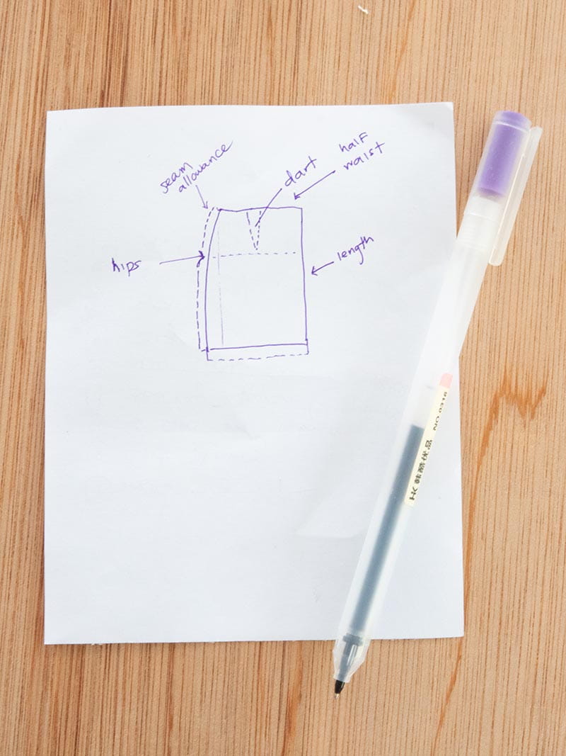 - At the bottom of the skirt line, add a hem allowance of about 1”.