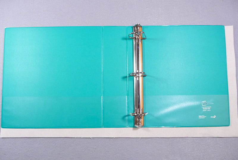 Fuse craft fleece to wrong side of front cover piece. See example of all cut pieces and sizes for my 3-inch binder in Figure #3.