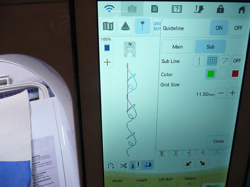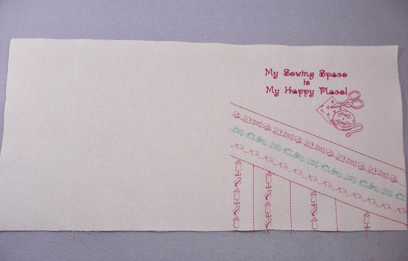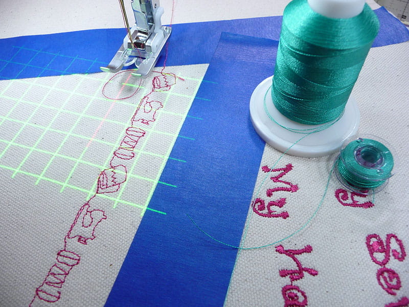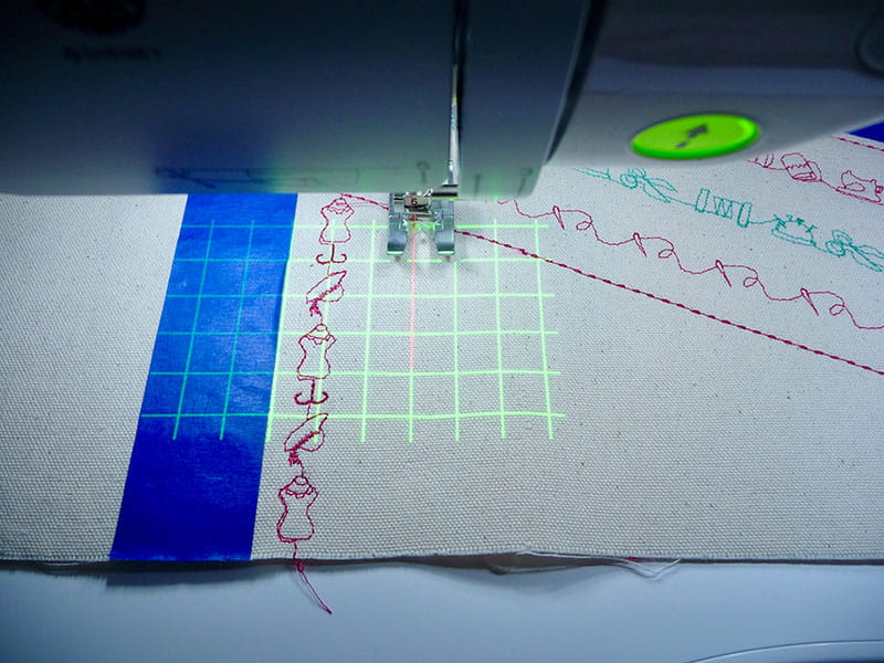 Tips: I added straight stitches to define horizontal and vertical areas, then used a combination of horizontal and vertical rows of stitching. I attached SA216, the N+ foot for smooth and stable feeding of decorative stitches. In addition, I used the Grid Projector to help align my stitches. You’ll find this feature especially helpful for alignment of stitches that have multi-motion movement and are larger than the standard 7mm throat plate opening. I love the way the gridlines help me sew lines of stitching without veering off track. Simply keep the gridline consistently parallel to a defined line and watch the line instead of the needle as you sew. You’ll find this serves as a big benefit for keeping the path straight as you stitch. See Figure #8a through Figure #8f.