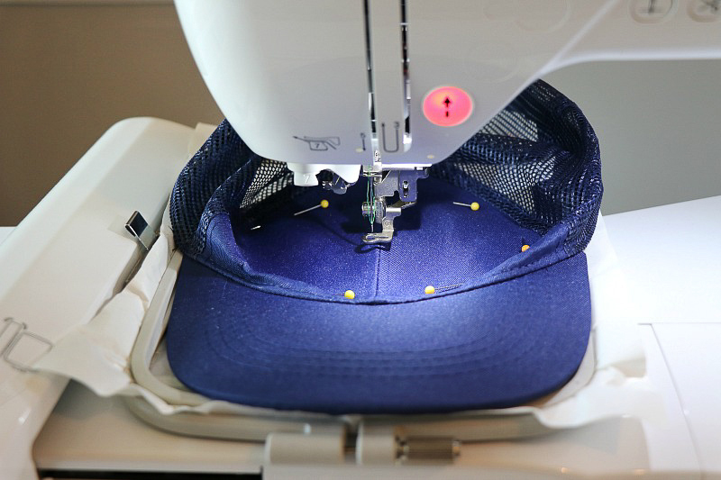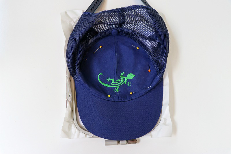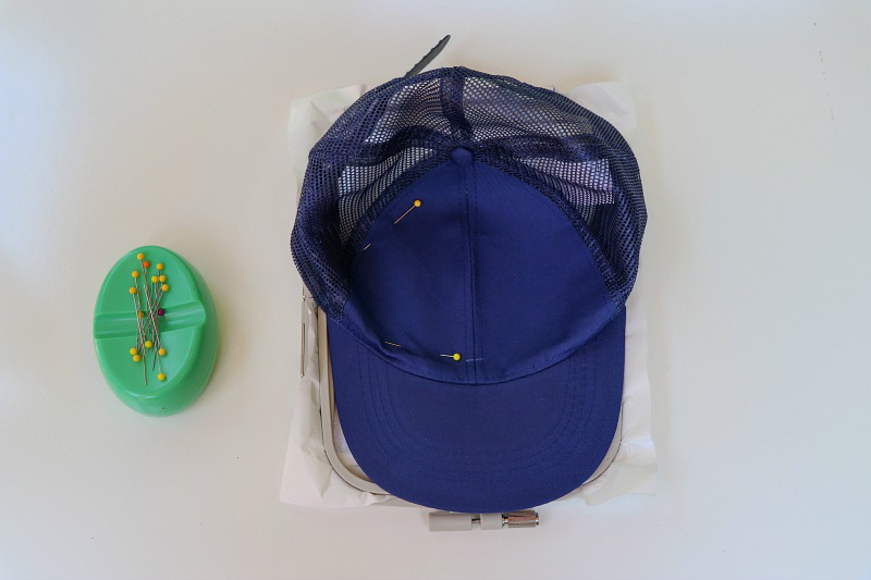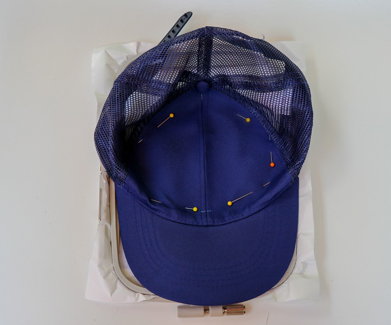 - Place the cap onto the adhesive stabilizer matching the center lines. My hat had a seam right down the center which made it easy to keep everything centered. Adjust the hat to be even and flat by pressing with your fingers rather than pulling/stretching. Pin and or baste stitch into place on the outsides making sure the pins are not near the design outline.