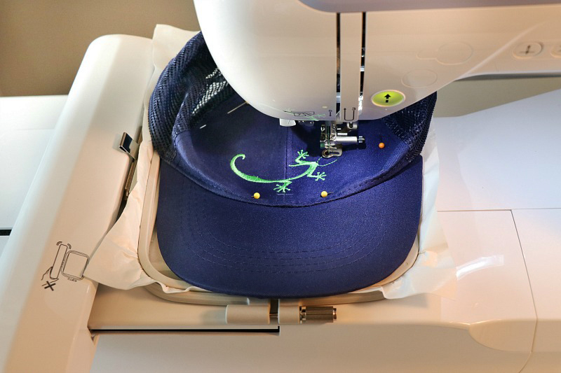 One of the things I love most about machine embroidery is the ability to create custom items and gifts. Embroidering designs, lettering, and monogram on basic items can instantly transform them into works of art. Lately, I’ve really been getting into embroidery on hats! They’re a great gift to kick start my kids summer break by embroidering their favorite reptile: a lizard from the built-in designs offered from the Brother PE800 Embroidery Machine.