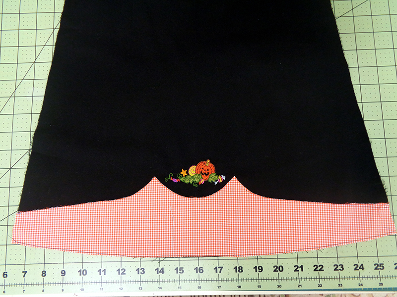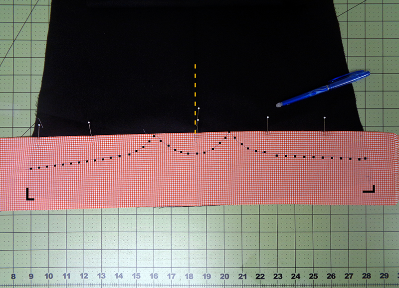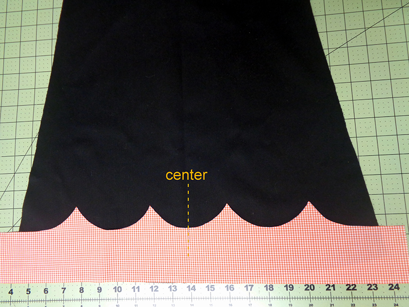 - Adhere gingham to skirt hemline, using template to mark center scallop on gingham. Transfer 1 ½” mark to outer edge of gingham, matching to edge of black skirt. Continue marks to edge of skirt.