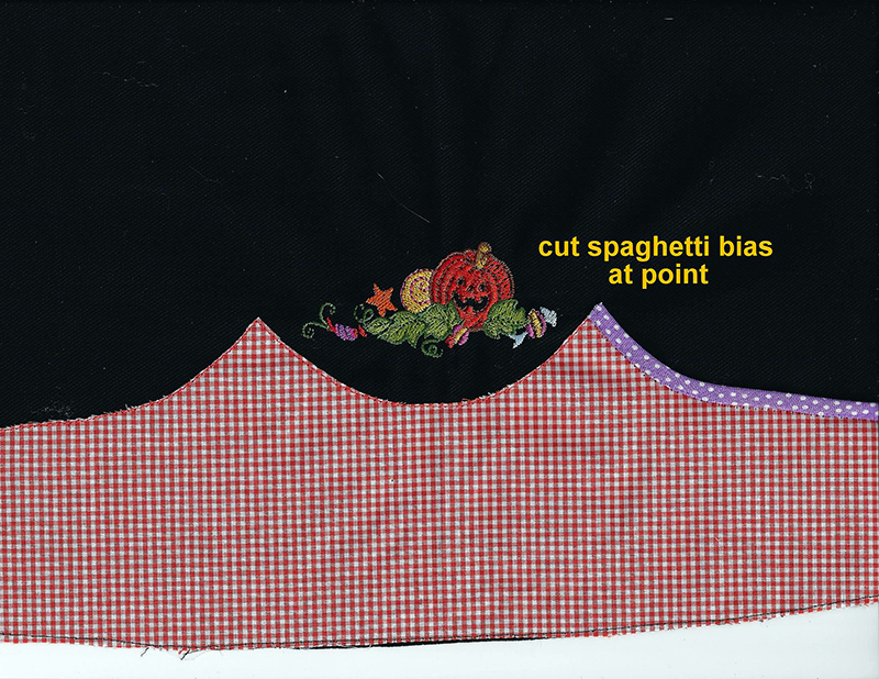 - Stitch on lower side of bias with monofilament thread and zig zag W 1.0, L 1.0 stitch. Cut spaghetti bias when peak of scallop is reached.