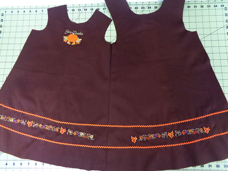 - Embroider Give Thanks pumpkin below neckline.