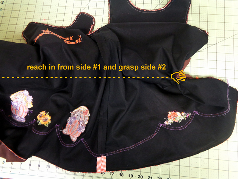 - With black/Halloween side on top, reach your left hand in between layers. We’ll call that side #1. Reach across to the right open side and grasp the black dress front, called-- you guessed it-- side #2.