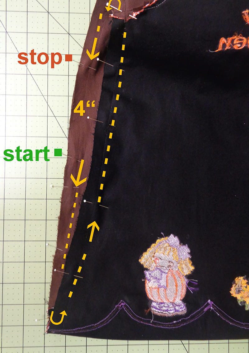 - Apply piping across top, from left armhole to right armhole. By using white contrasting bobbin thread, it will be easier later to seam the Halloween and Thanksgiving sides by stitching directly on the piping seam line.