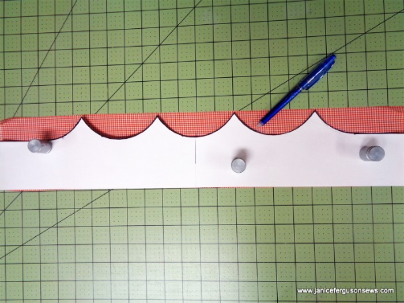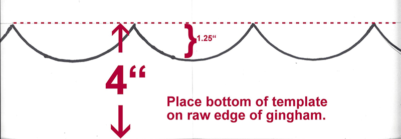 - Place bottom of template on the raw edge of the gingham strip, matching the center of the strip with the mark on the center template scallop. Trace scallops on the gingham with a water or heat erasable marker.