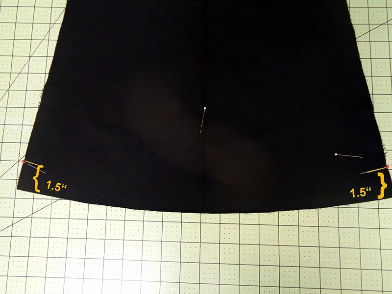 - Press vertical crease back. Mark crease with straight pin at hemline.