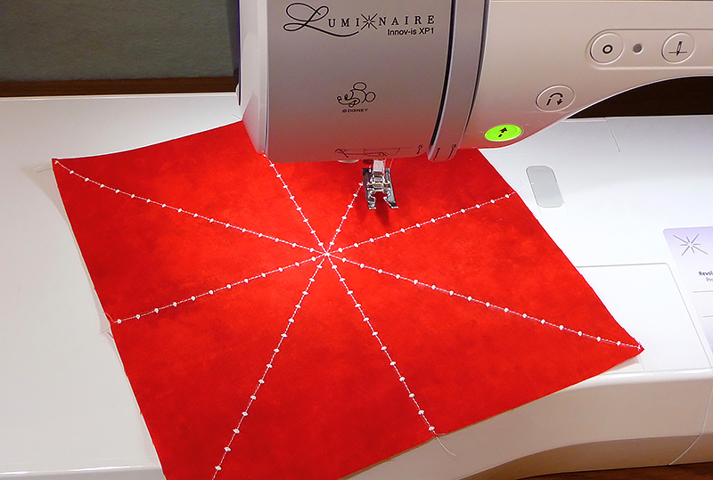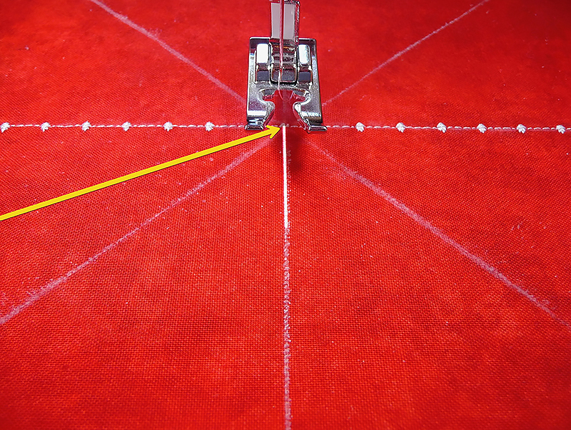 - Beginning at the center, sew along each marked line, tying off stitches at the beginning of each line. Tip: Use the guideline marker feature to help line up your stitching if you have this option. See Figure #9.