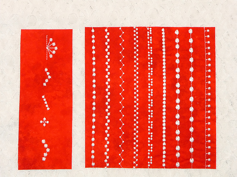 On the left is an example of Multi-Motion stitches that have been stitched in a single pattern. On the right is an example of 5mm to 7mm wide stitches sewn in a row.