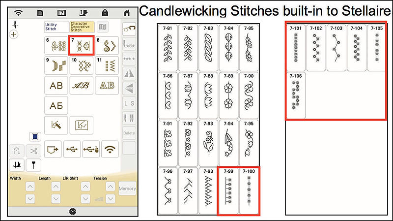 See Figure #3 for an example of candlewicking stitches built-in to the Brother XJ1 Stellaire.