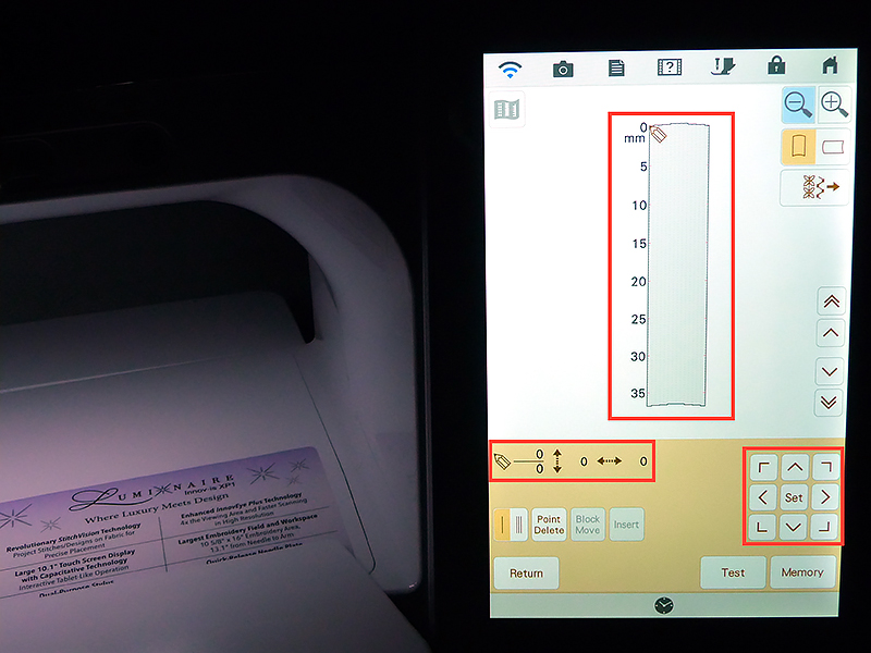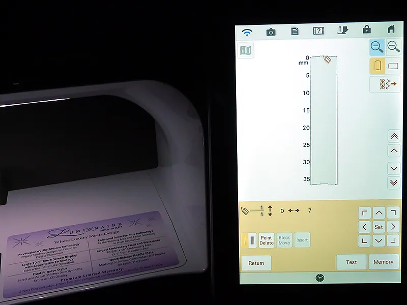 Remember, each time you enter a set of coordinates you need to touch SET in order to set the stitches. When you get to the end of the sequence, you will have formed one full stitch pattern. When finished, touch Test and try out the stitch. To save the stitch, touch the memory pocket and save to your desired location.