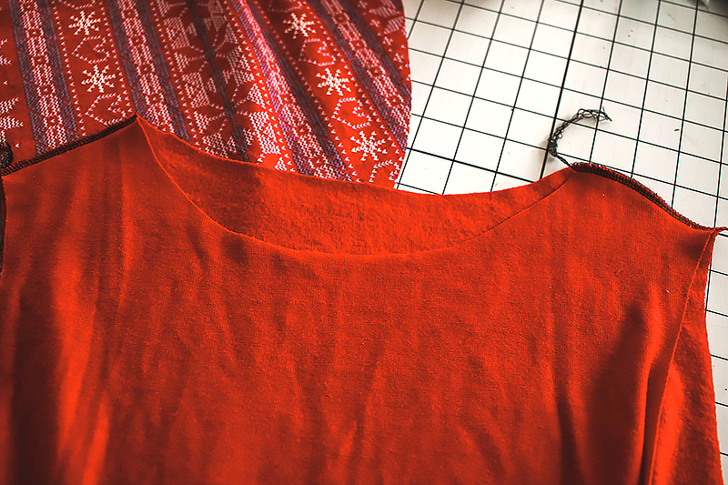 Sew the shoulder seams with the right sides together of the shirt fabric.