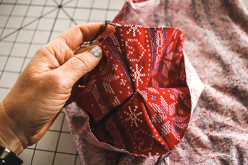 Sew the cowl to the shirt with the three raw edges lined up. I used my serger to sew it. If you don’t have a serger make sure you use a zig-zag or other stretch stitch to attach the cowl to the neckline.