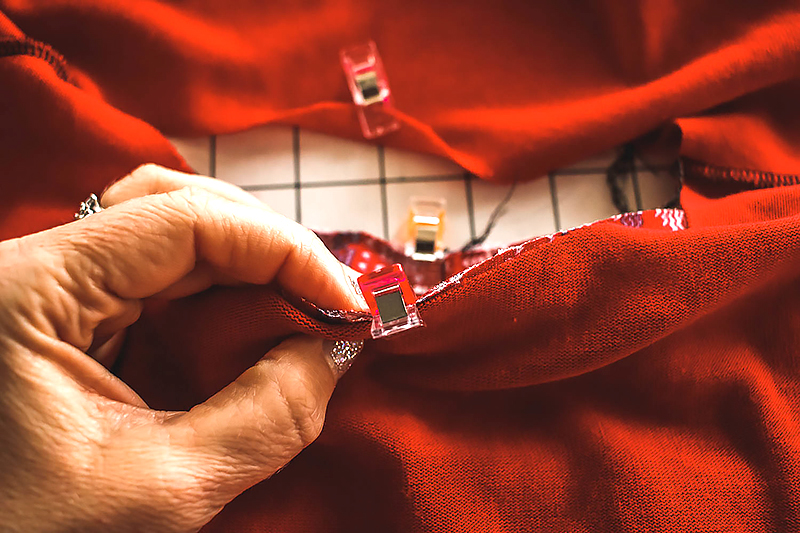 Stretch and clip the cowl all the way around the shirt neckline. Depending on the shirt pattern you use, you may have to stretch the cowl more or less around the neckline.