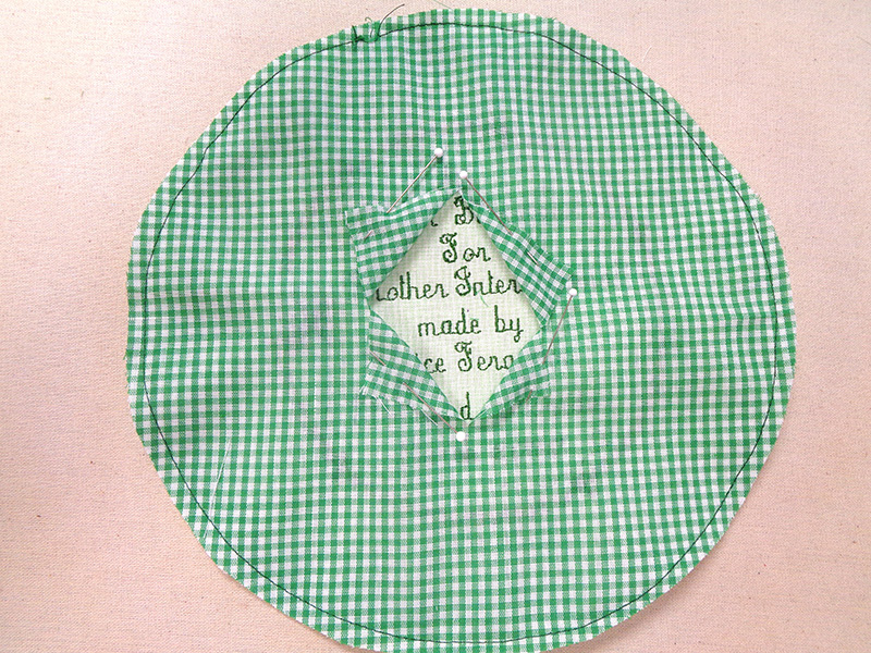 22. Stacked the embroidery face down on lining which matched the quilt backing. Pinned it in place.