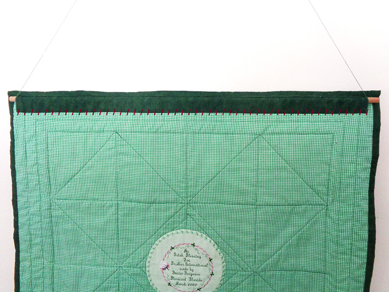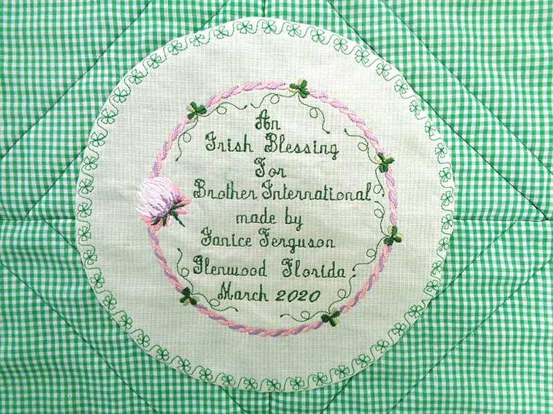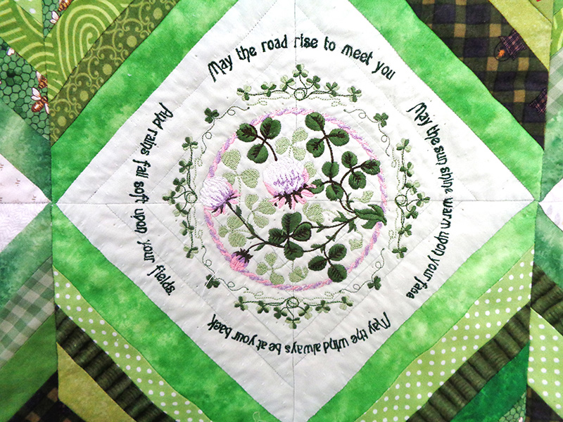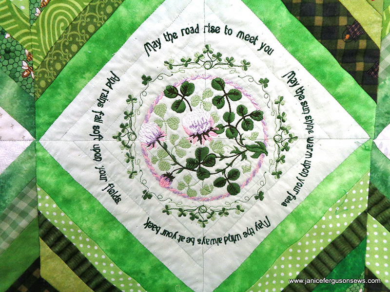 19. Quilt as desired. The Irish Blessing was quilted with monofilament in the needle and green cotton thread in the bobbin.